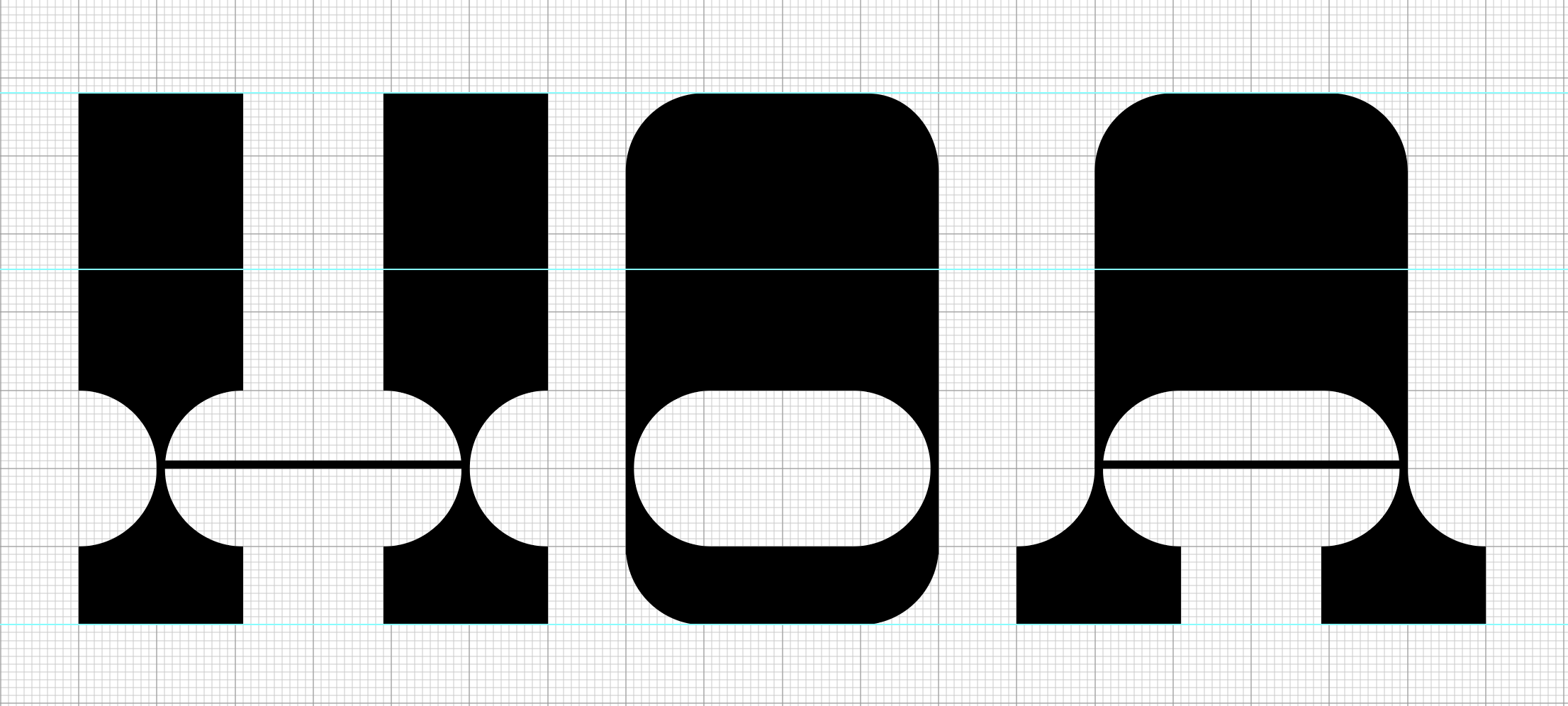 Keep the shapes proportional in one set; do not scale or distort any of the components. Do not overlap the elements or use a white shape knocked out of black forms. All the letters in a typeface are distinct from each other, yet they share many attributes.