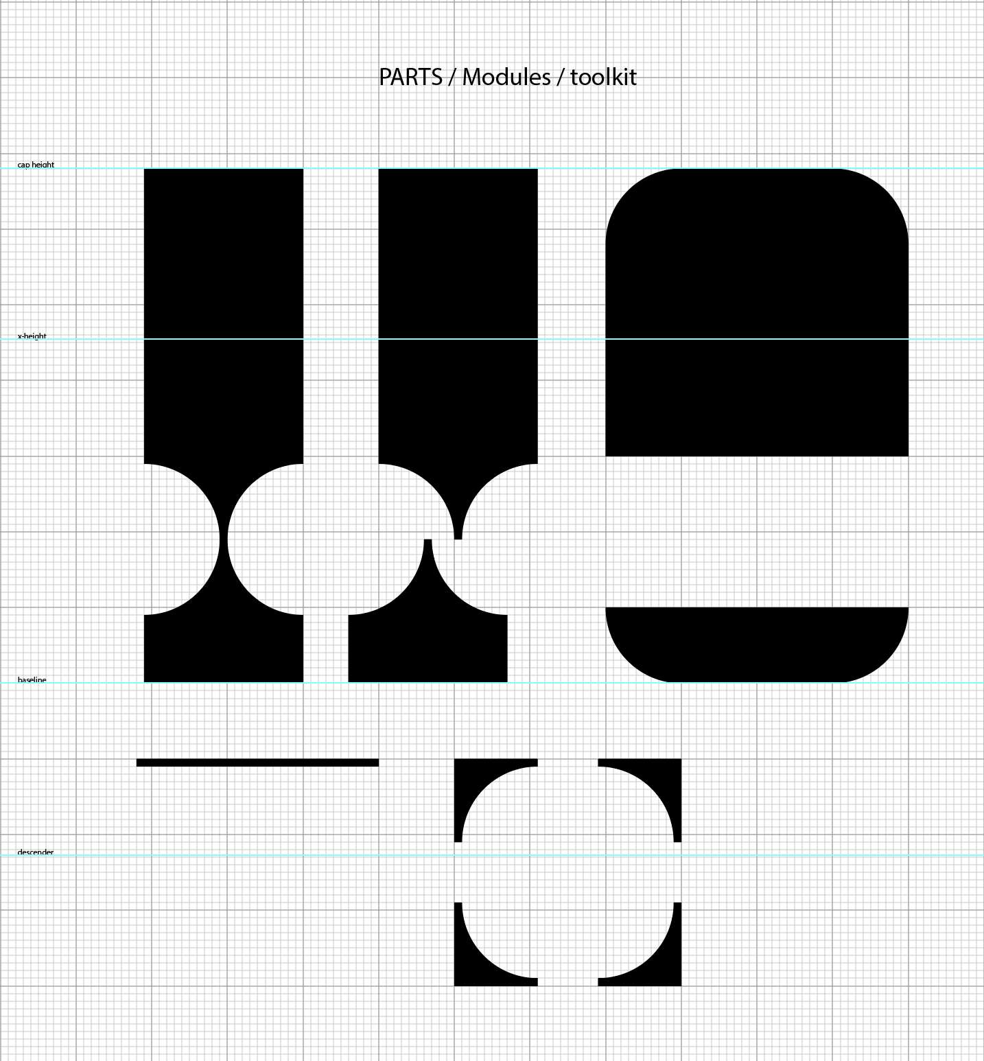 Parts Make the Whole asks you to use the context of a modular letter construction to create a prototype for a modular font. A minimum of 26 upper-case or lower-case characters (you are not required to create both). You may choose to create a unicase font combining typical characteristics of upper and lower case characters. Your letterforms must be modular/rational/repeatable forms: parts of letters are used to make other letters. You will start by designing letters on a grid of squares or a grid of dots. You may substitute the curves and diagonals of traditional letterforms with gridded and rectilinear elements. Only rules are you can not use handlettering or develop letters based on some existing font, the letters must be constructed. Avoid making detailed “staircases,” which are just curves and diagonals in disguise. Explore your modular system. Once you have defined your system, made some letters, refined them to something new, the new will become your system to create all 26 letters of the alphabet. We will work in Adobe Illustrator and you will use the software Glyphs to output your final set of upper or lower case letters as a usable, shareable, font.